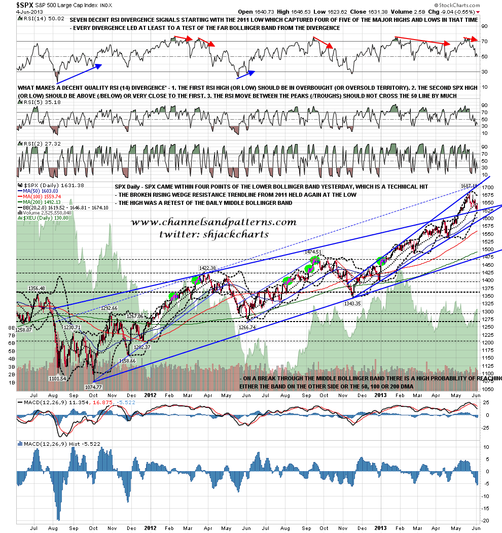 On the SPX daily chart we saw a bounce to test the daily middle bollinger band and then a reversal to retest the broken rising wedge resistance trendline from 2011 that has been holding as support this week. It’s worth noting that yesterday’s low was only four points above the daily lower bollinger band so I’m counting that as a technical hit and we could well see a bounce from that hit of a key technical support level. SPX daily chart: