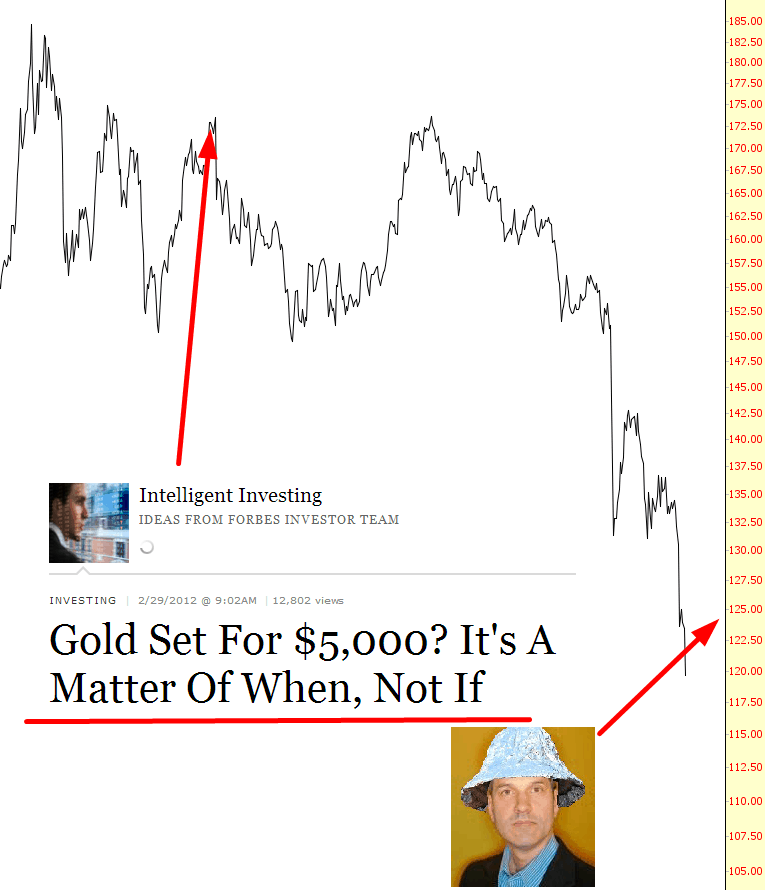 Meanwhile, in the obscure world of fringe financial blogging, there’s little old me, who has been calling for gold to fall to “somewhere between 1250 and 1300”. The funny thing is that gold has exceeded my once-laughable target. So don’t necessarily accept what the giants tell you – like, oh, say, the guys at Forbes. Sometimes the weirdos are the rightos.