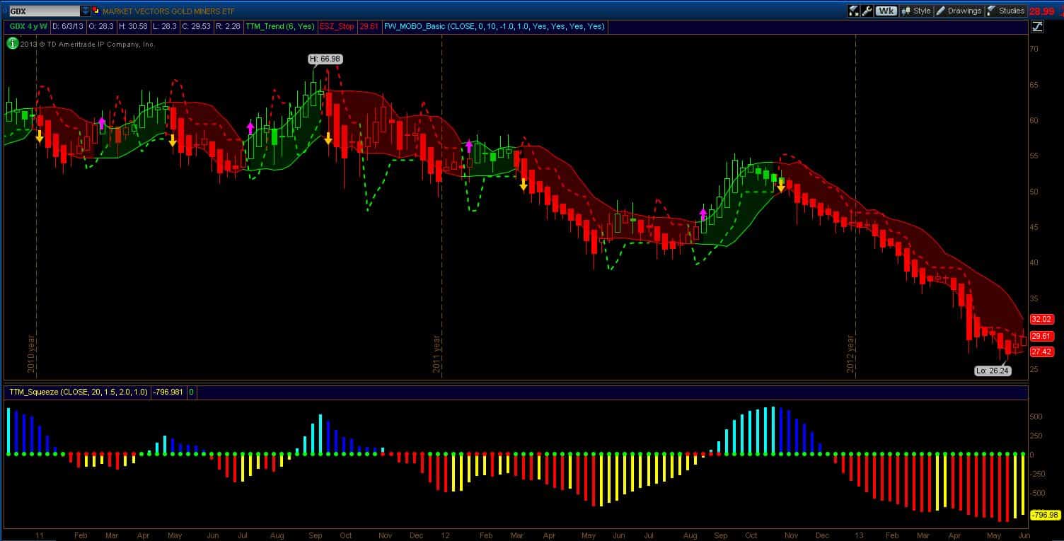 GDX (below) is still in a downtrend but price action is pushing up against the short stop. There are also two hollow candles which are early warnings that the trend might be changing. Sell-side momentum has moderated as well.
