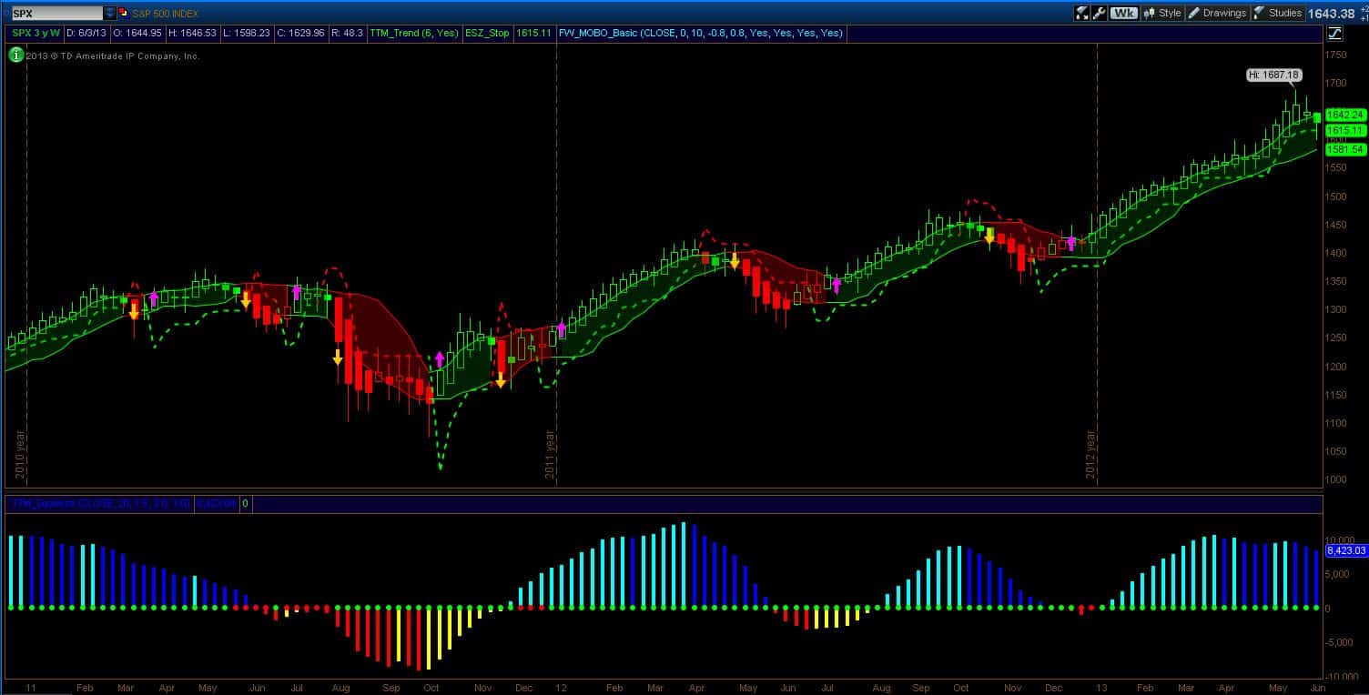 I also said that this can be hard ride out when this happens and I offered a suggestion as to how to deal with that scenario. This week, there is another early warning sign with a filled Heikin Ashi candle (see my introductory post for an explanation of HA candles). This follows the narrow body candle of the previous week. Momentum breakdowns are nearly always preceded by a solid HA candle (in the chart below, they always are) and the long stop is most often triggered by a one of these candles – but not necessarily the first one. Also note the declining candle tops and declining buy-side momentum on the Squeeze indicator.