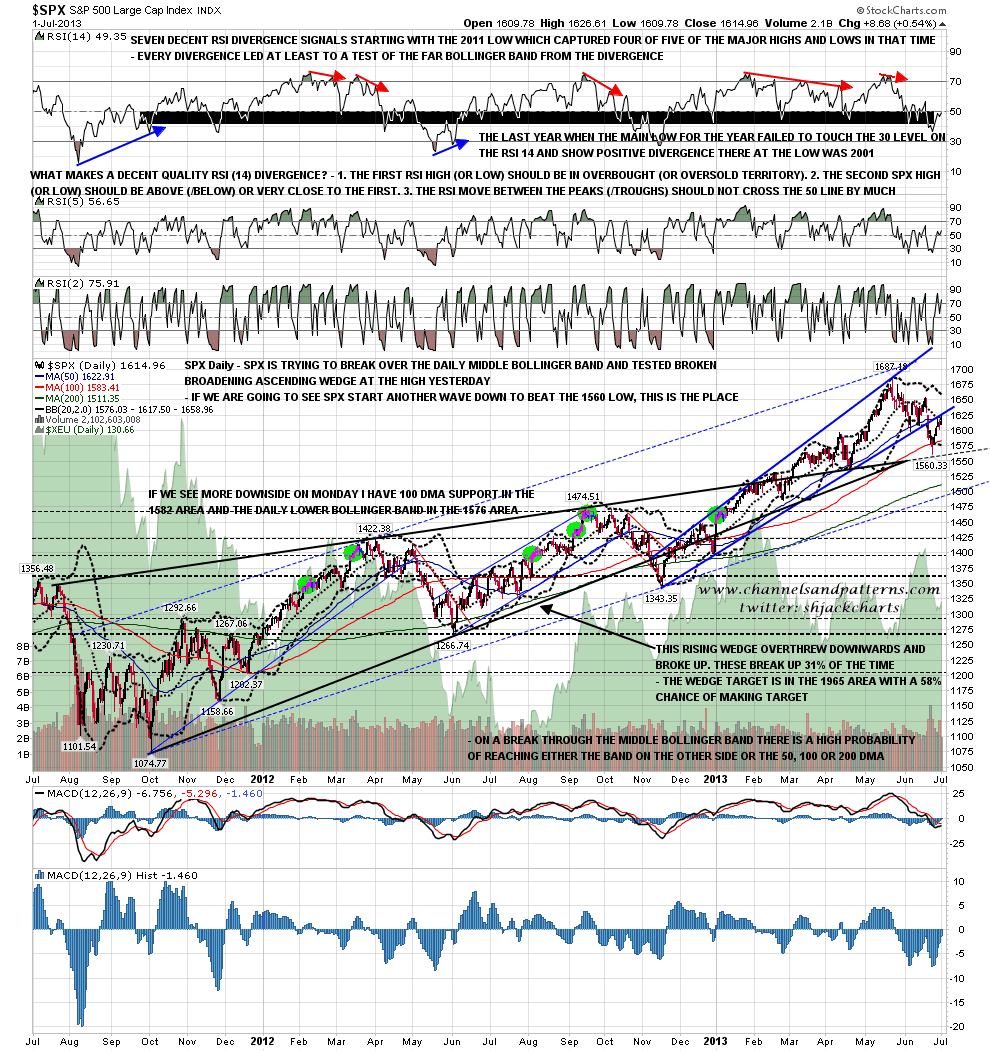 On the SPX daily chart the high yesterday was a failed attempt to break over the daily middle bollinger band, and SPX closed the day back slightly under there. If we now see a return to the daily lower bollinger band, that is now in the 1576 area. SPX daily chart: