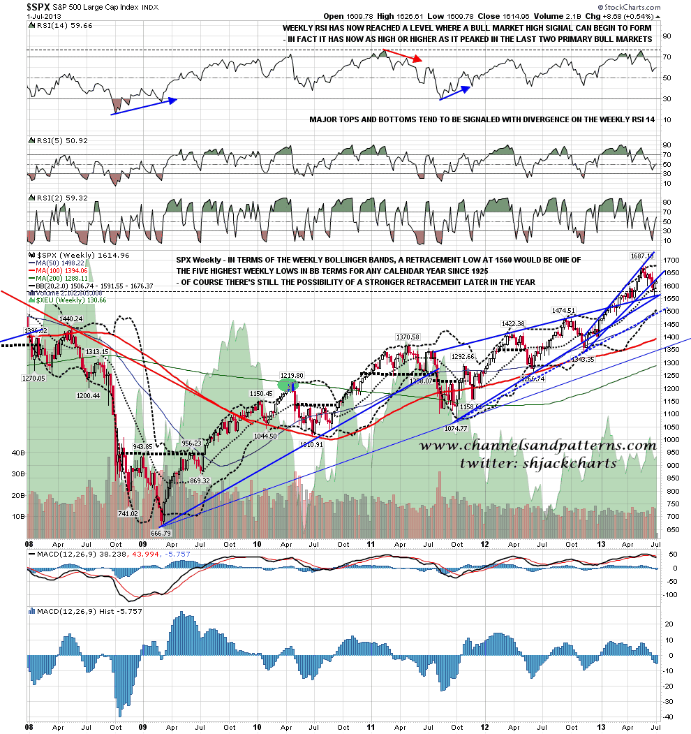 I would be leaning strongly towards a low in that case near 1515, and am not expecting primary bull market rising support in the 1495 area to be hit. SPX weekly chart: