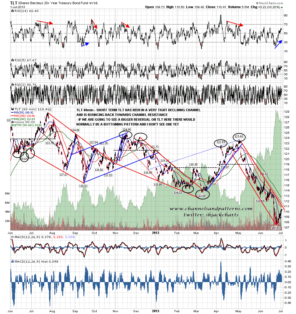 On TLT I’m watching to see whether TLT can make any kind of decent low near the key 105/6 support level. There is a decent declining channel from the 123.68 high and a break above there would look bullish, but we would normally see a clear reversal pattern on TLT at a big reversal, and I don’t see that yet. TLT 60min chart: