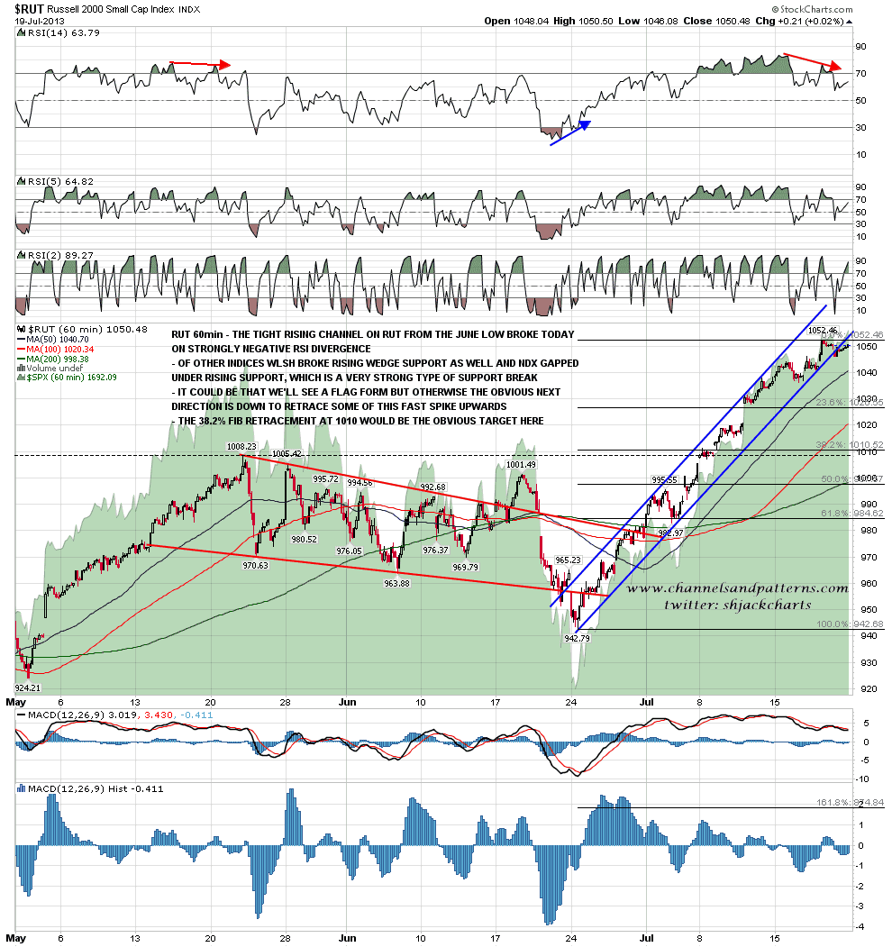 On other US indices we are seeing the same negative RSI divergence and some signs of breakdown. NDX broke trendline support first but WLSH and RUT also both broke trendline support from the June low on Friday. Here is the break below the very tight rising channel on the RUT 60min chart: