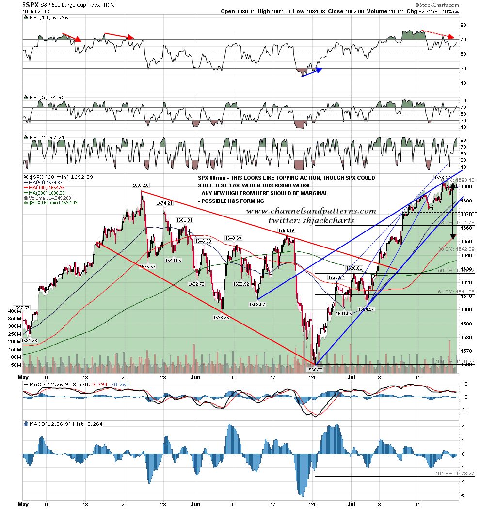 On the SPX 60 min chart I have trendline resistance in the 1697-1700 area, and a lot of negative 60min RSI divergence. SPX 60min chart:
