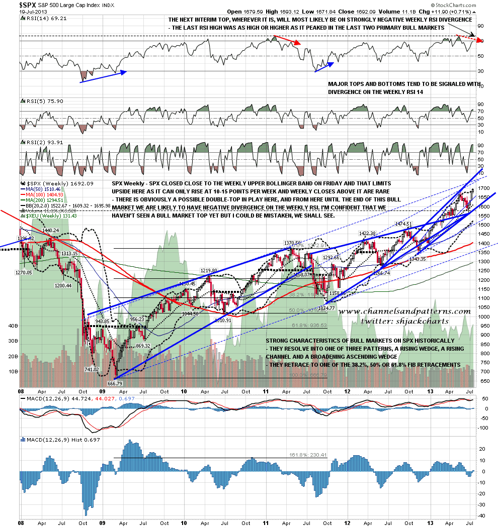 If we are to see a retracement shortly, or indeed if the bears are to get the double-top they are looking for, then this is the place to see it. At the least we should start seeing more two way action here now because SPX closed just under the weekly upper bollinger band on Friday. Weekly closes above this are rare, and even in a strong uptrend this can only rise 10-15 points per week, so more two way action now is likely. SPX weekly chart:
