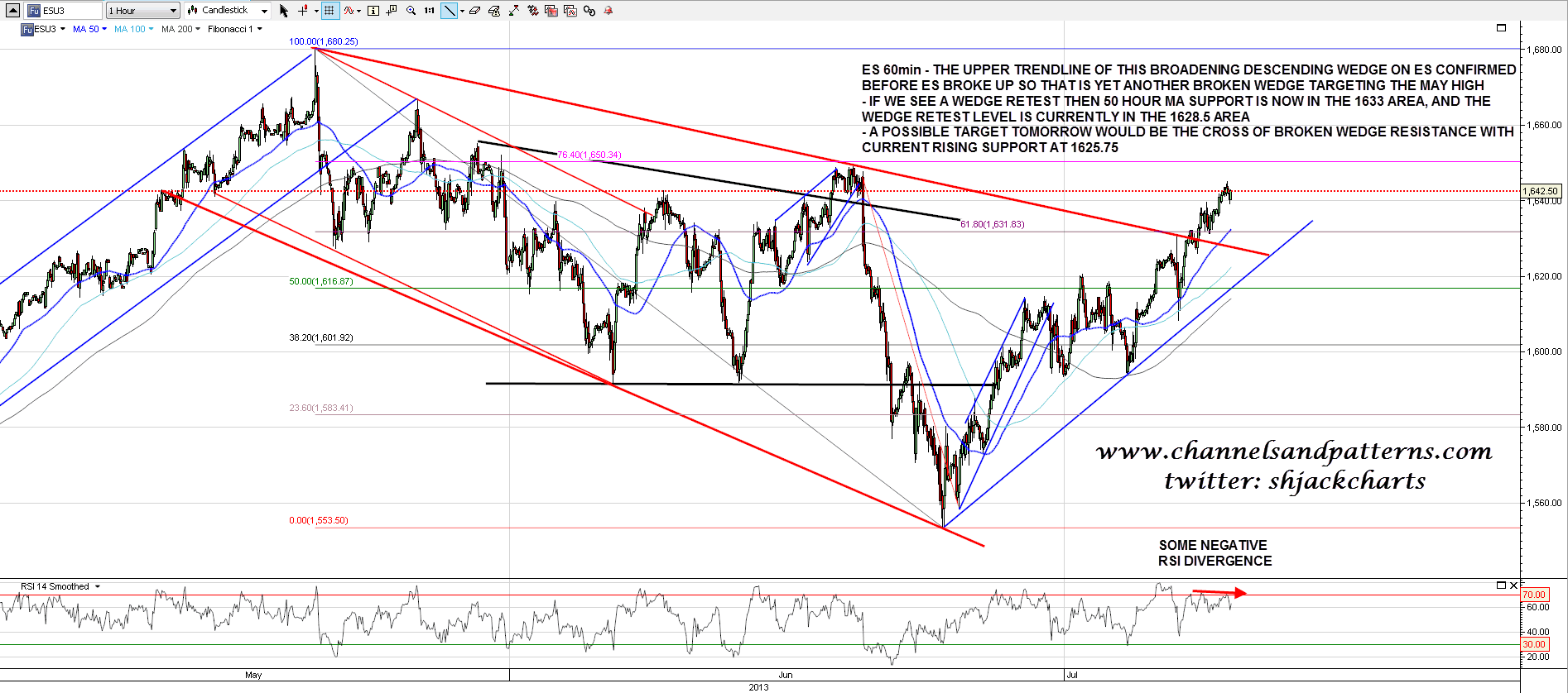 The pattern setups on SPX and ES are often different as ES trades 24 hours. Not in this case however where yet another broadening descending wedge has broken up. If we are to see a retest the first decent signal for that would be a break below the 50 hour MA, currently in the 1633 area, and that wedge retest level is currently in the 1628.5 area. An attractive target is the cross tomorrow of broken wedge resistance with current rising support, and that will be in the 1625.75 area. The equivalent cross on SPX would be on Thursday in the 1632 SPX area (approx 1627.5 ES). ES 60min chart: