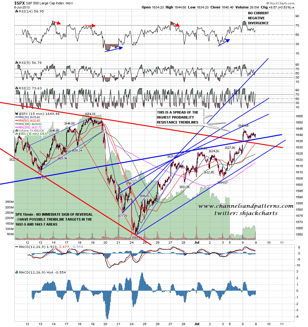 What I’m saying here is that we are back on buy the dip for another indefinite period until we see another big reversal. Until then the bear case is dead in the water unless we see strong evidence to the contrary. In the short term I am wondering about a possible retest soon of broken wedge resistance on SPX, and I have marked in three possible trendline targets on the SPX 15min from which we may see the next short term reversal. I’m seeing the highest trendline target as lowest probability. There is currently no negative RSI divergence on this SPX 15min chart: