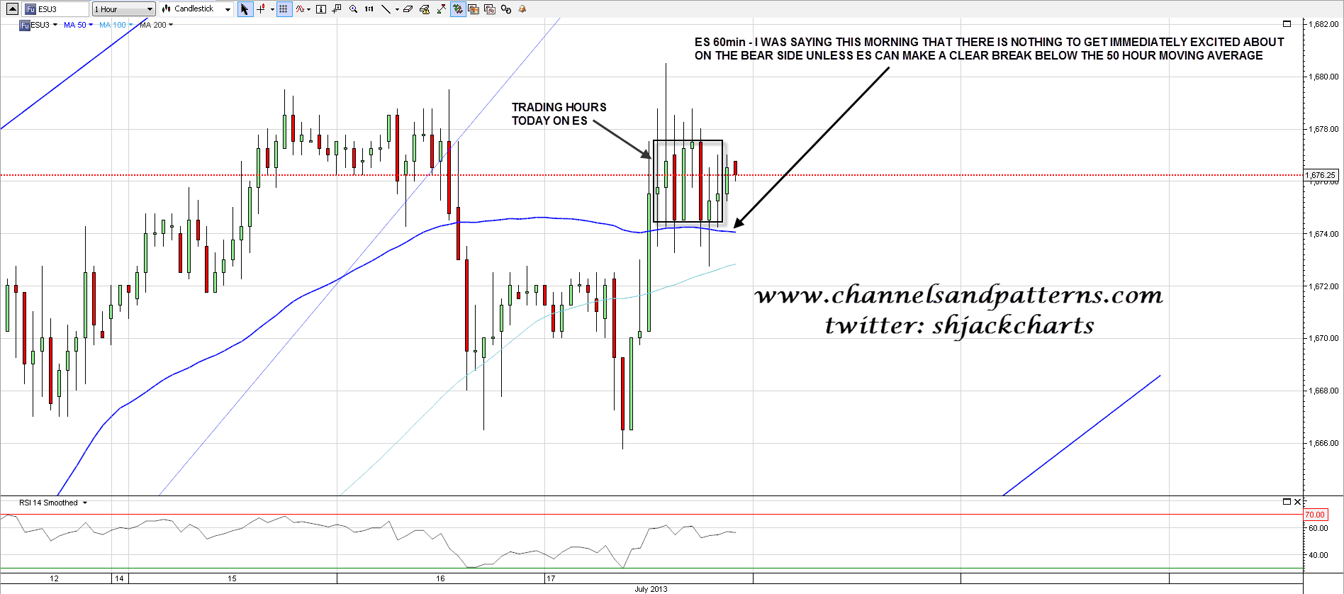 We’ve seen some really boring days on ES recently and yesterday was another of those, with ES spending the entire day testing the 50 hour MA from above. There was a slight break below that overnight but it didn’t hold. Here’s the ES 60min chart I posted on twitter last night after the close showing the narcolepsy -inducing action for the day. ES 60min chart: