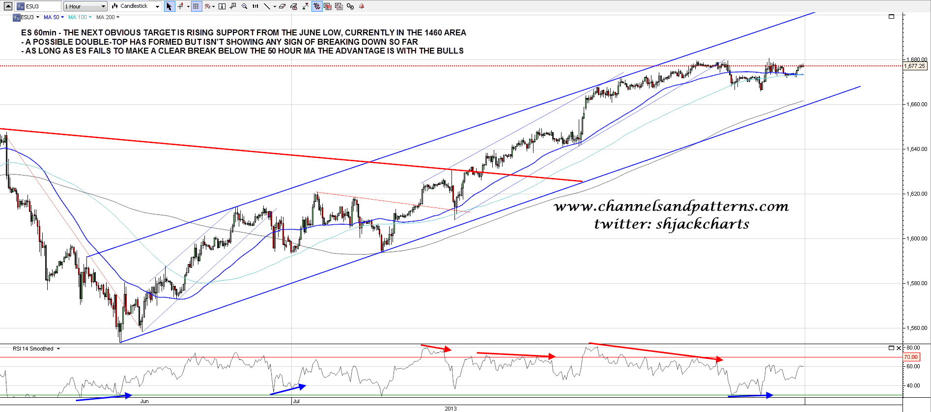 So what are we seeing there? That might have been a bull flag, but if so it would have needed to break up overnight. Equally there is a nice looking possible double-top there as well, but that’s starting to look rather stretched and with no sign of real selling pressure so far. On the rising wedge from the June low the next obvious target is the wedge support trendline, currently in the 1660 area, but there’s no reason to think that ES and SPX couldn’t push up to more definitive new highs before that trendline is hit. ES 60min chart: