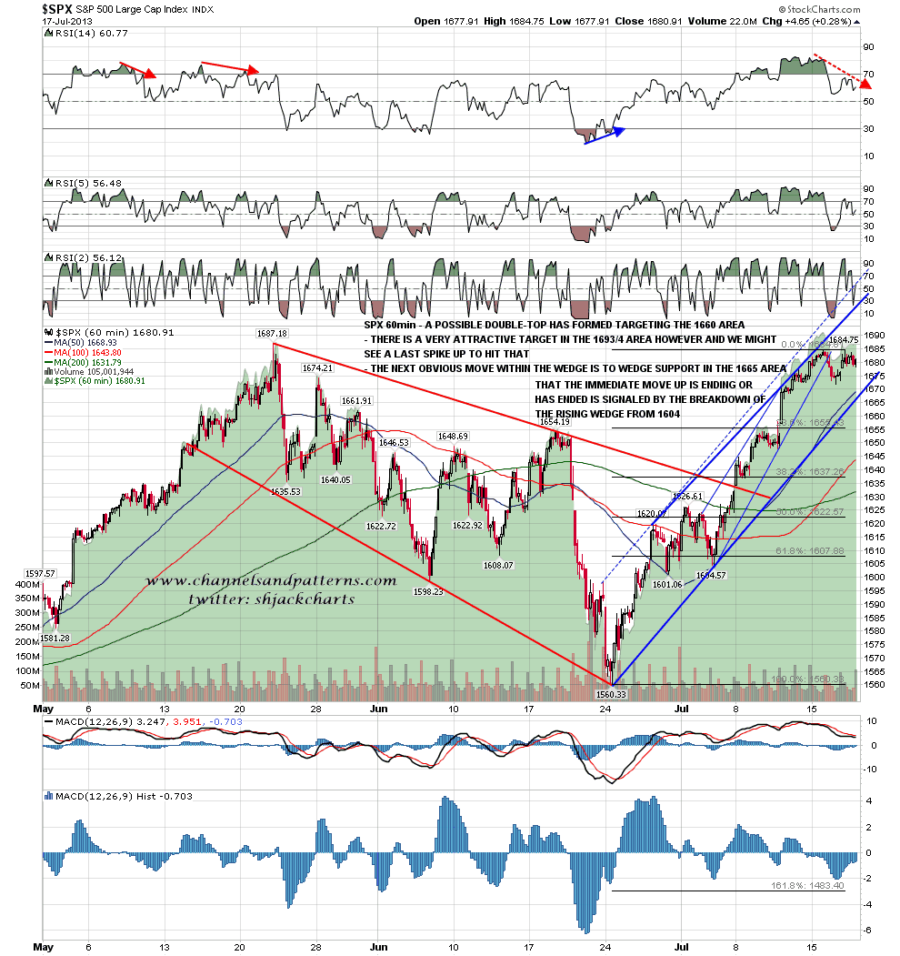 Rising support on SPX is in the 1655 area, very close to ES rising support, which isn’t always the case. There is a possible double-top forming there too and the RSI and trendline setup is arguing strongly for a more definite retracement soon, but we could see a push up to the 1690-1700 area without compromising that setup. SPX 60min chart: