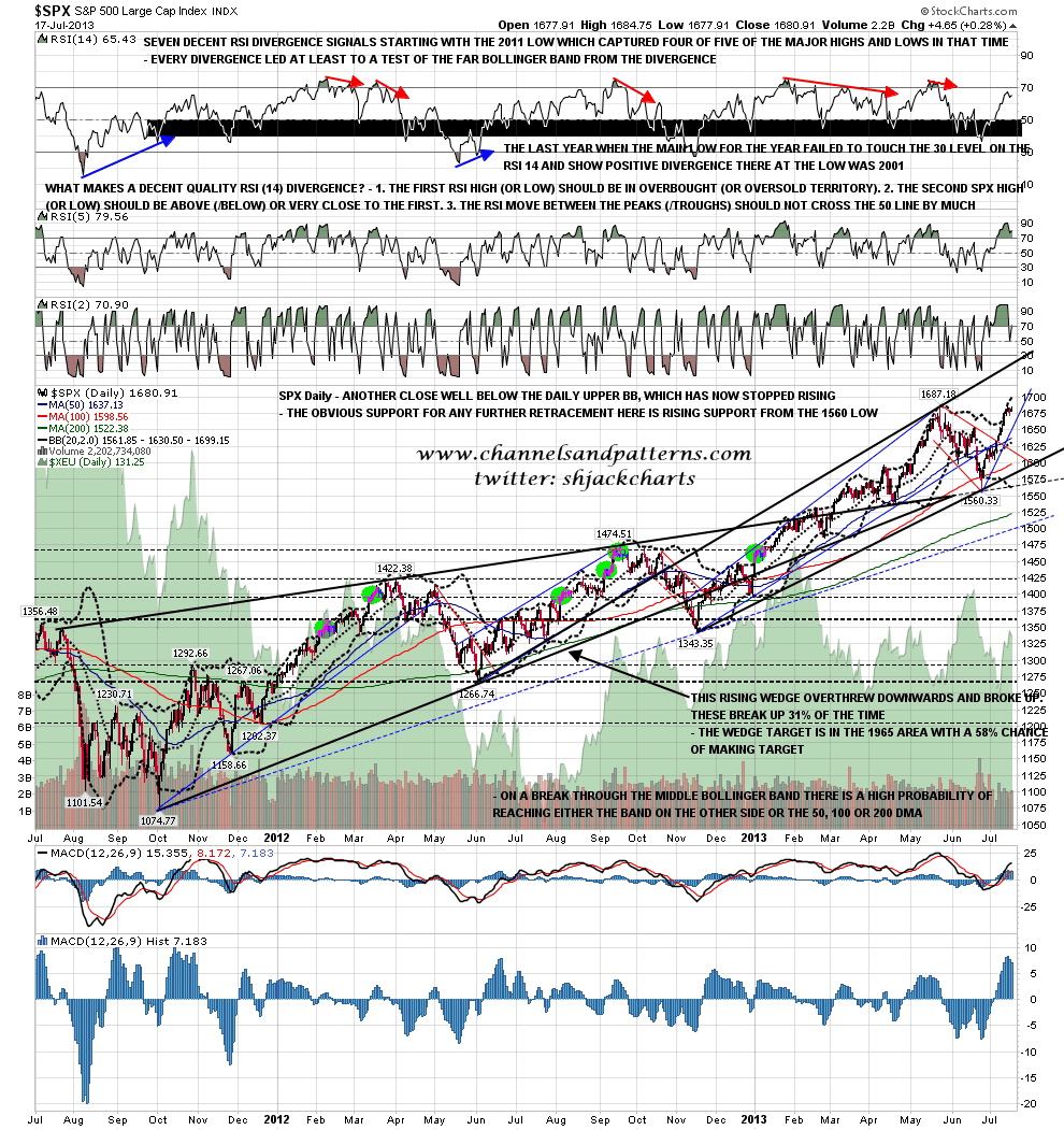 If we do see another push up is there an obvious target for that? Yes there is. At the close yesterday the weekly upper bollinger band was at 1693 and the daily upper bollinger band was at 1699. Both are attractive targets for a further push up, and if those were hit then we would most likely see a larger retracement start from there. SPX daily chart: