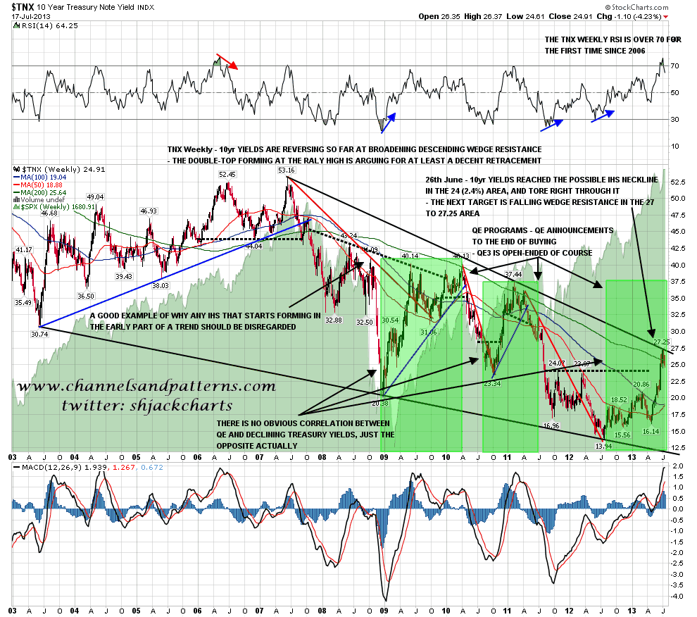 I’ve been posting bonds charts every day for the last couple of weeks, and at the risk of boring everyone who doesn’t trade bonds, I’ll be posting two more today, as I think that this is perhaps the most interesting of all the trade setups that I am watching at the moment. On the 10yr weekly chart TNX hit and very slightly overshot resistance on the broadening descending wedge from 2003, which is often an indication that the wedge will break upwards on the next hit. I gave the target range on 26th June at 27 to 27.25 and the current high is 27.25. There is no negative divergence on the daily RSI, but at the high RSI was over 70 for the first time since 2006. TNX weekly chart: