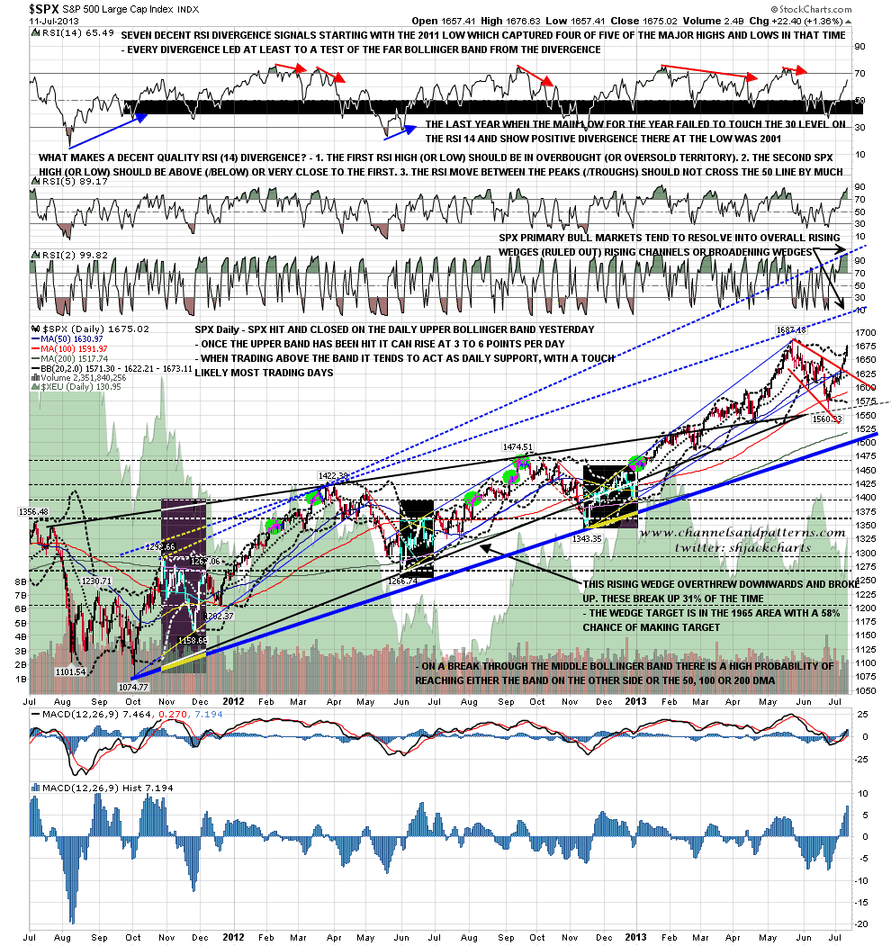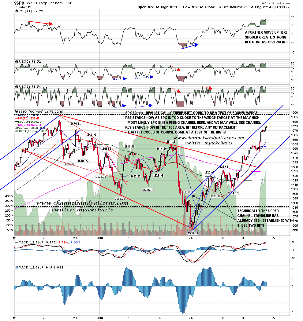 I posted a SPX 60min chart on twitter after the close yesterday showing likely rising channel resistance in the 1680-5 area. That is now a very attractive short term target. If we see some early weakness before a rise into that resistance we may well also see strong negative 60min RSI divergence develop. The best divergences develop from very overbought/sold levels and RSI was trading over 80 on the SPX 60min yesterday. SPX 60min chart: