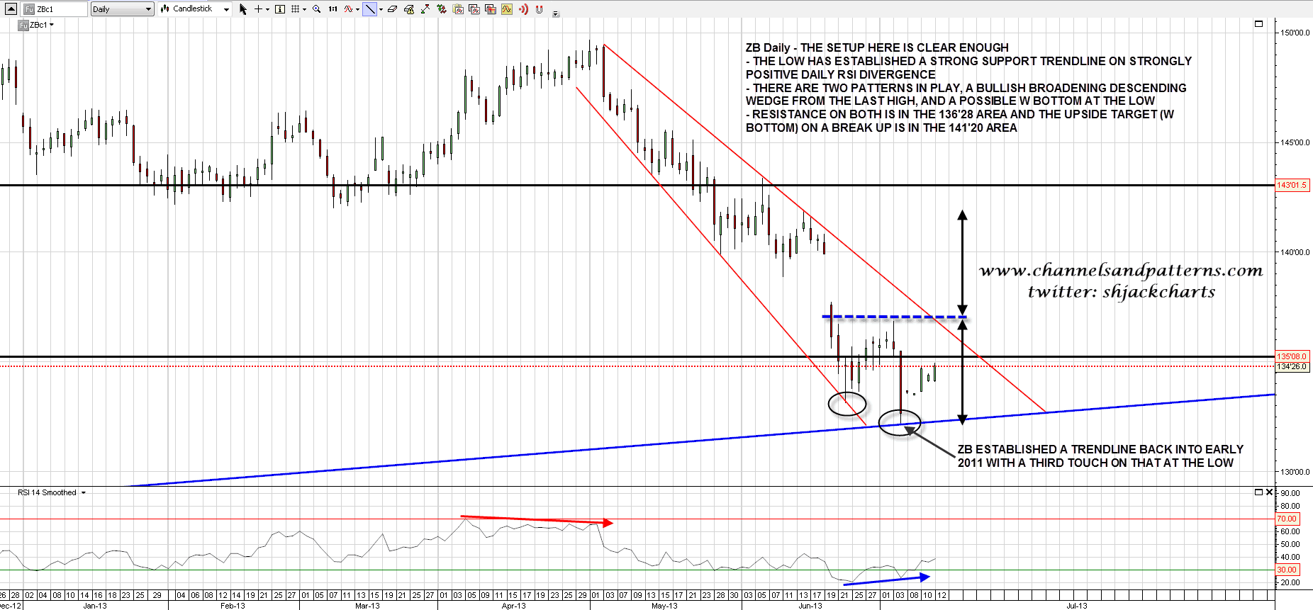 Lastly bonds where I think ZB is in the process of making a significant trend reversal that may last months. In the short term the setup is a bullish broadening descending wedge from the last high and a possible W bottom forming on strongly positive daily RSI divergence. This is a very attractive reversal setup, particularly so because TLT has hit major support, I have a nice looking larger H&S scenario where we would see a big rally to establish the right shoulder on that H&S, and further that ZB made the third hit on a previously established (though previously weak) support trendline back into early 2011. The figures are on the chart but in broad terms a break over 137 would target the 141/2 area. ZB daily chart: