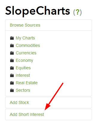 I am very happy to announce that SlopeCharts – introduced just a few days ago – already has a cool new feature: short-interest charts. You can now plot the short interest in a stock independently or, more likely, on top of the underlying securities. Here’s the new entry field: