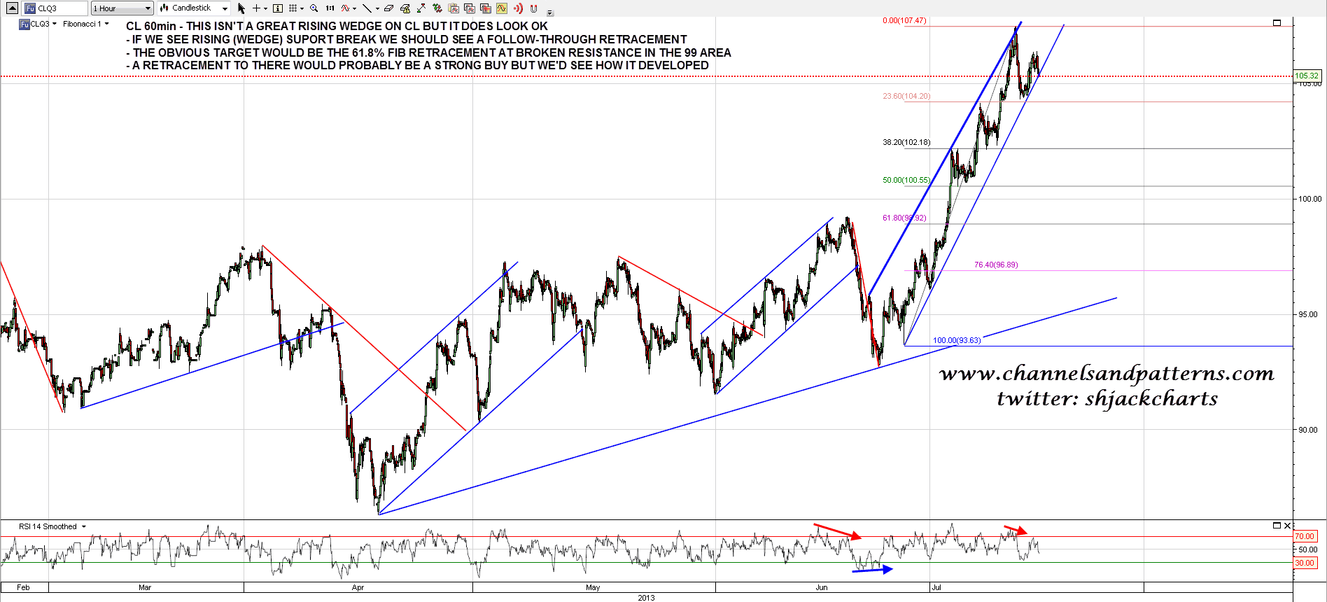 Lastly CL where an ok but not great quality rising wedge has formed since the last low, and since I capped this chart that has now moved from testing wedge support to having broken down from there. I’m expecting more downside and my preferred target is the 61.8% fib retracement and broken resistance in the 99 area. It is very possible though that we will see a test of the highs and possible marginal new high before that main retracement to make the second high of a double-top and establish negative divergence on the daily RSI. CL 60min chart: