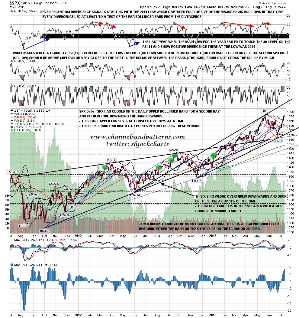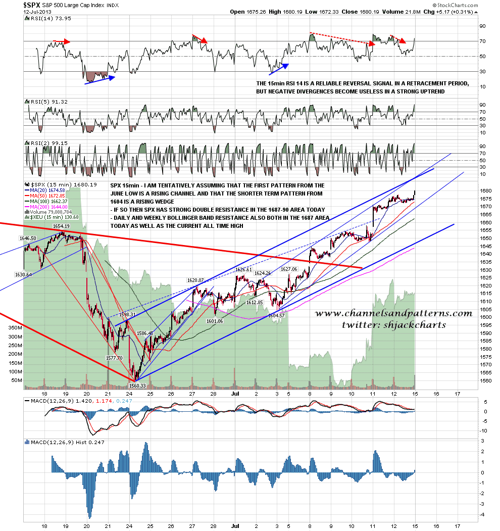 I’m pressed for space today so I’ll skip the SPX 60min chart and show the 15min chart instead. On there the pattern setup as I see it is that there is a likely rising channel forming (and arguably already established) since the June low, and the current lower degree pattern within that is a rising wedge from the 1604 low. What’s worth noting is that the resistance trendlines for both patterns should cross in the 1687/8 area this morning, and that is also a decent fit with both weekly and daily upper bollinger band resistance. That is key resistance today and we may well see a reversal there to test rising channel support, currently in the 1647 area (and rising by 6/7 points per day). That reversal could just be a sideways consolidation of course. I’ve drawn the last two negative 15min RSI divergences on the chart with the note that in a strong uptrend all RSI divergences smaller than the daily chart RSI become very unreliable. SPX 15min chart:
