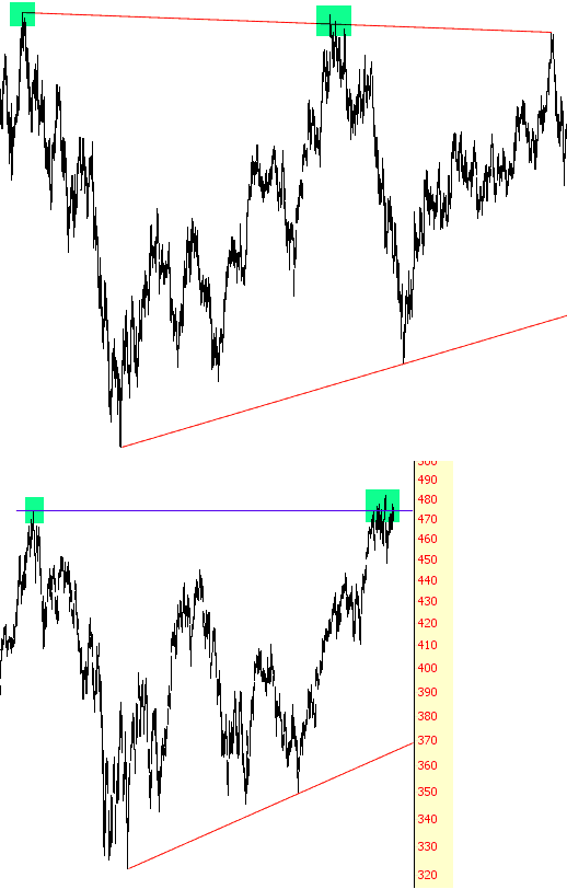 I found the analog below quite interesting. It shows the semiconductor index, or $SOX. One the top is the 2004-2007 time period; on the bottom is the recent past. Note the two tinted areas, and note particularly how the second one overshoots the trendline just a little Interesting, yes?