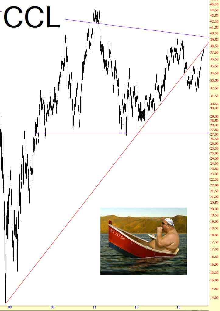 Carnival Corporation, which provides the invaluable service of letting fat Americans take a break from overeating on the land and spend some time overeating on the water, is sporting a pretty big bearish engulfing candlestick pattern today. I’ll be shorting it. As a totally random aside, I’ll mention I just finished watching United 93 for the first time, and it was excellent. For the sake of political correctness, I won’t go into my views on the “religion of peace”, but I think the movie is a valuable reminder as to divergent cultural values and American bravery. It was amazing to watch.