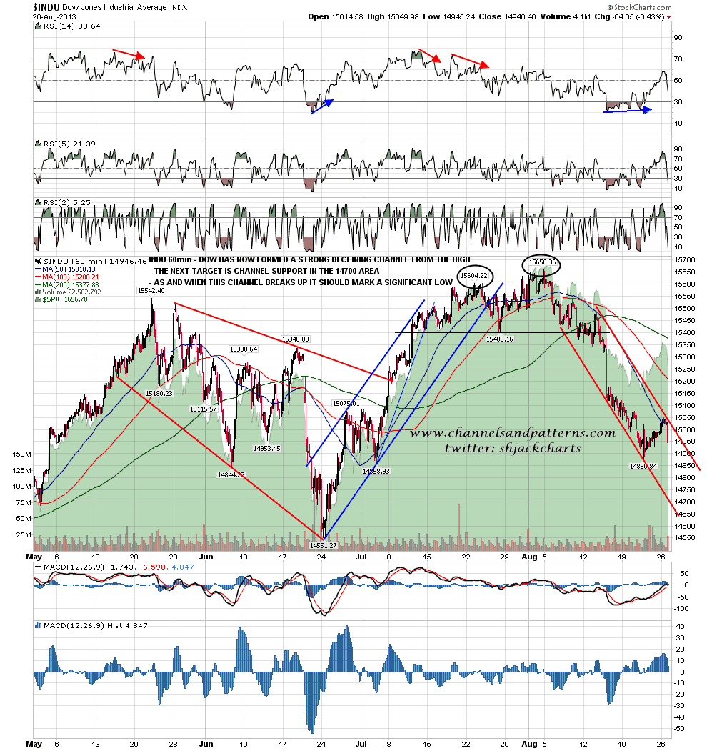 The other declining channel to be established at the high yesterday, and the strongest in terms of trendline hits, is on Dow, and that is a key channel to watch here. This is the steepest channel and I have channel support in the 14700 area today. INDU 60min channel: