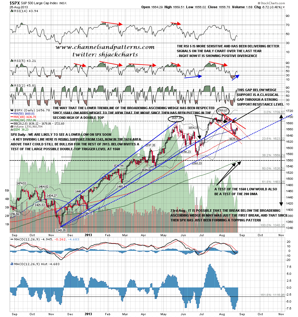 On other markets oil has broken up to a new high on news that war with Syria is increasingly likely. I’ll post my WTIC weekly chart today to remind everyone that I have a triangle there that targets the 2008 highs in the 147 area, and that the most recent low was a retest of broken triangle support. With another war in the Middle East in the air this is definitely worth bearing in mind and shorting oil could get VERY expensive over the next few weeks. WTIC weekly chart: