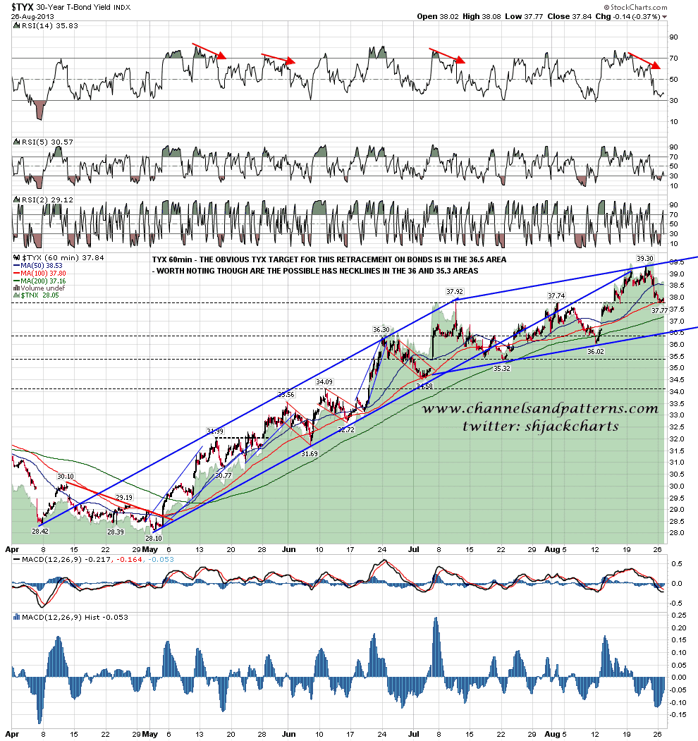Bonds have strengthened as equities have weakened over the last day and so my rally scenario on ZB is still looking good, with the double-bottom target at 133 almost made and the declining channel target over 134 getting closer. However today I’ll post the inverse of that ZB chart on the TYX (30yr Bond Yields) chart. You can see the inverted setup there as at the close yesterday, with rising channel support in the 36.5 area looking good with ZB breaking up overnight, and possible H&S necklines in the 36 and 35.3 areas. This is just to point out that this rally on bonds may extend further than my 134 target on ZB. TYX 60min: