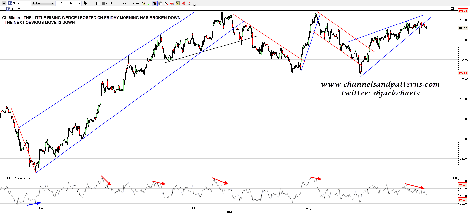 On other markets CL has broken down from the small rising wedge that I posted on Friday. The next obvious move is down. CL 60min chart: