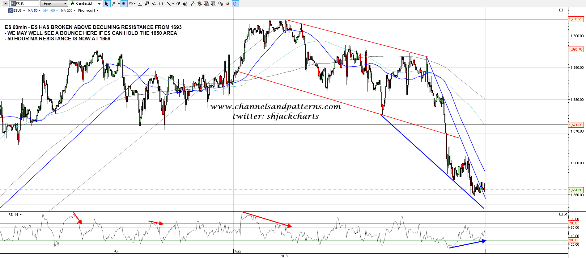 On ES the bounce setup also looks promising, as declining resistance from the 1693 high has been broken overnight and, since I capped this chart below, perfectly retested. There is also currently positive 60min RSI divergence. If ES can hold the 1650 area then this is a strong bounce setup. ES 60min chart: