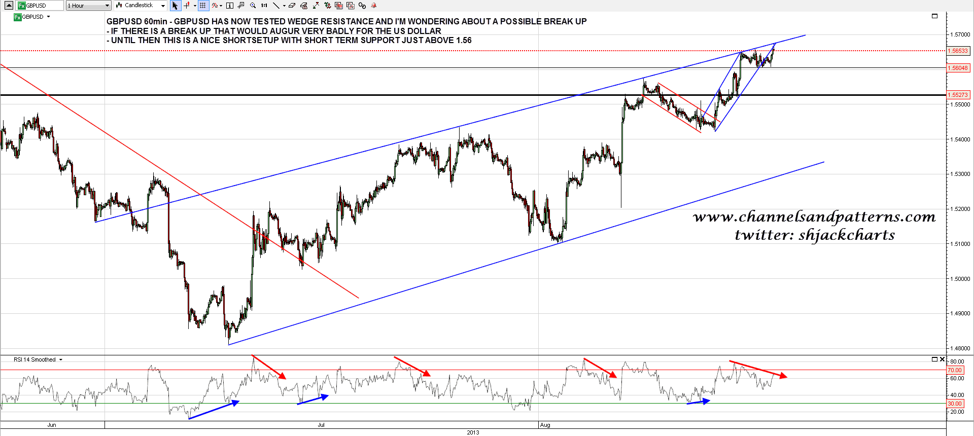 On GBPUSD there have now been three tests of rising wedge resistance.It could break up and if so that would be a body blow to the USD uptrend, unless the break up turned out to just be a bearish wedge overthrow. Until then this is still a nice topping setup with resistance close above and the obvious target far below. GBPUSD 60min chart: