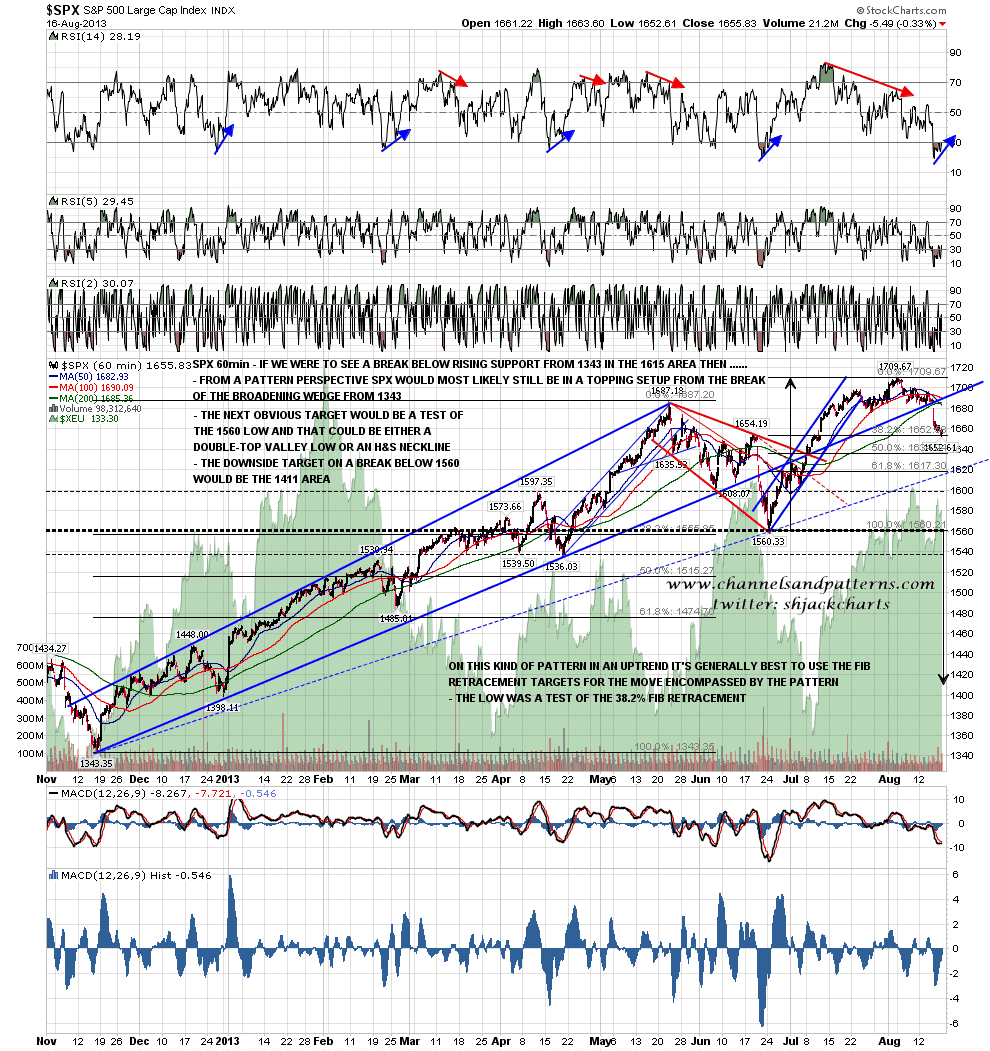 On the SPX 60min chart since last November I have drawn in the rising support trendline from 1343. This is a key support trendline on any ongoing bullish pattern I have from last year. If it breaks then the most likely pattern setup reverts to being that we are forming a big top from that low, with the 1560 low area being either a double-top valley low or an H&S neckline for a pattern on which the 1709 high was the top of the head. The 1617 level is also the 61.8% fib retracement of the move up from the 1560 low, so if we see rising support broken the next obvious target will be a retest of the 1560 low. SPX 60min chart: