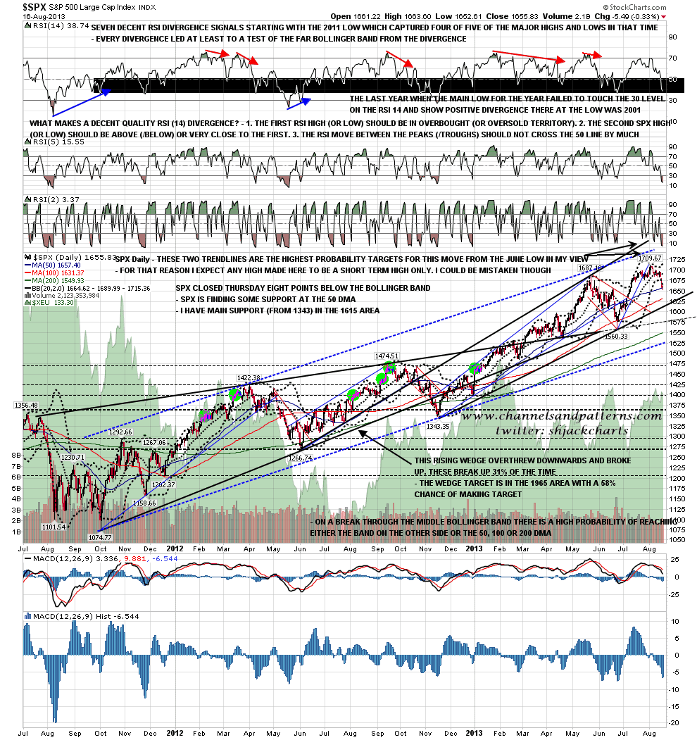 On the SPX weekly chart a serious concern for bulls here is that we have made, in effect, a marginal new high on strongly negative weekly RSI divergence. This is a signal for a possible major top, though RSI needs to make a lower low under about 56.5 for that signal to fully trigger. RSI (14) is now at 58.33 so that doesn’t leave a lot of room. On the weekly bollinger bands the next obvious support level is the middle bollinger band at 1635, and 1635 is also the 50% retracement level for the move up from 1560. On the best bull scenario for the rest of 2013 SPX shouldn’t go much lower than that. SPX weekly chart: