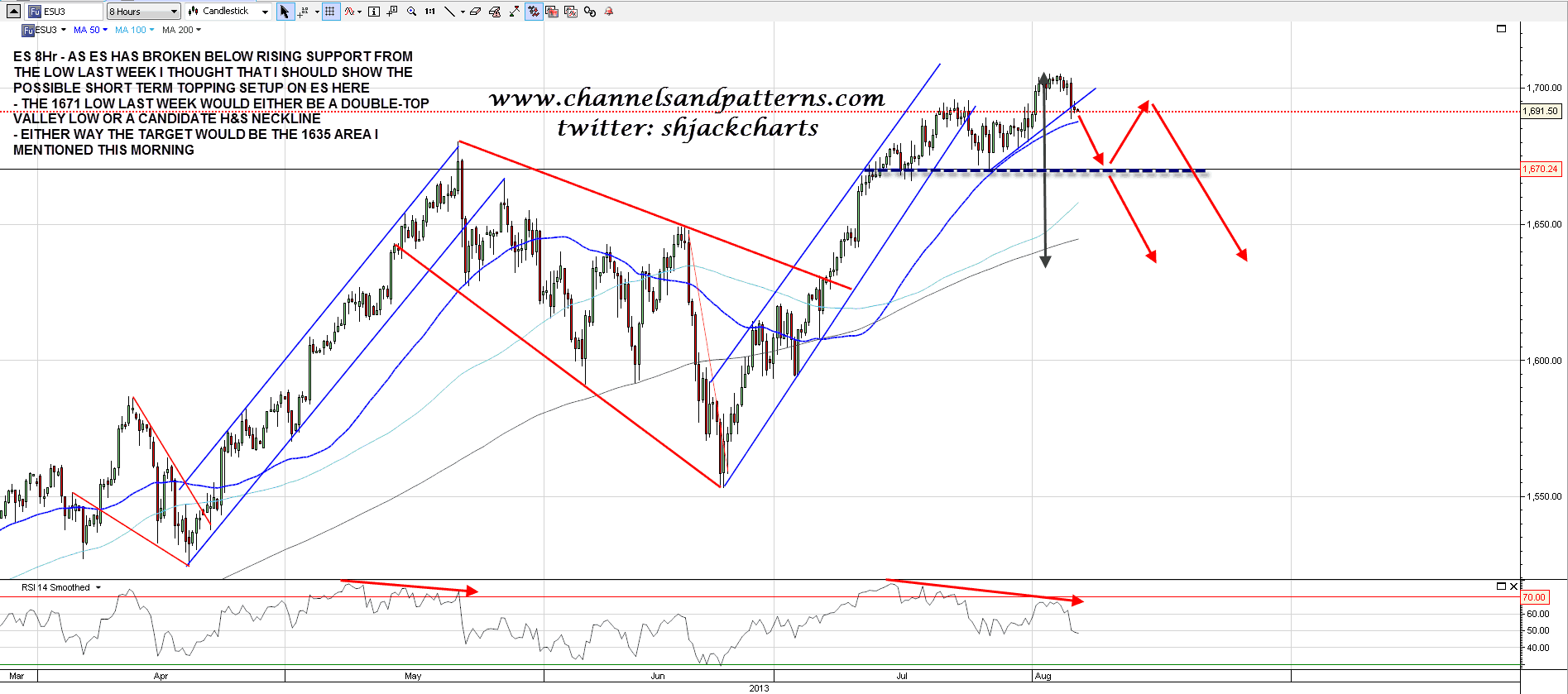 I posted the ES 8hr chart below on twitter last night showing the two main topping options here which are a double-top and H&S. The key level for both is last week’s low at 1670.50. If we see either form the downside target on a clear break below that level would be in the 1635 area. ES 8hr chart: