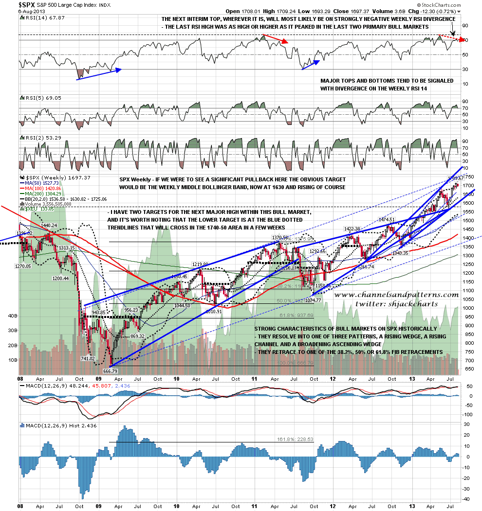 Is there any support for that target elsewhere? Well the weekly middle bollinger band is now at 1630 (and rising) so depending on the time taken to reach that target that might well be a very good fit with that target. SPX weekly chart: