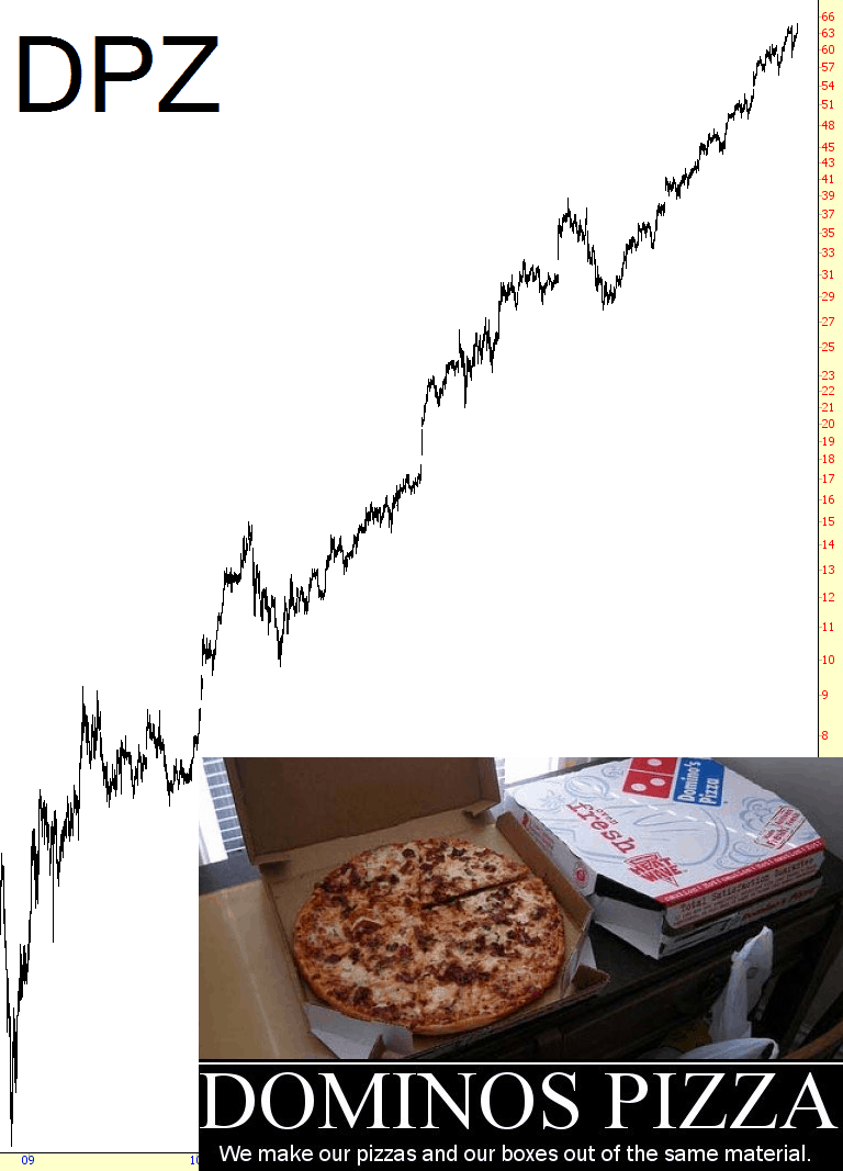 In my college years, one of the few foods that was too gross for us to eat was Domino’s Pizza. It was considered the most third-rate pizza in the world, appropriate only if there was absolutely nothing else available. I have been slack-jawed stunned at the chart below, since it would seem pizza technology has expanded to include hovercrafts, electric cars, and Star Trek transporters. One can’t argue with success, I suppose, but I still just don’t get why this stock has gone up over 2,000% in just a few years.