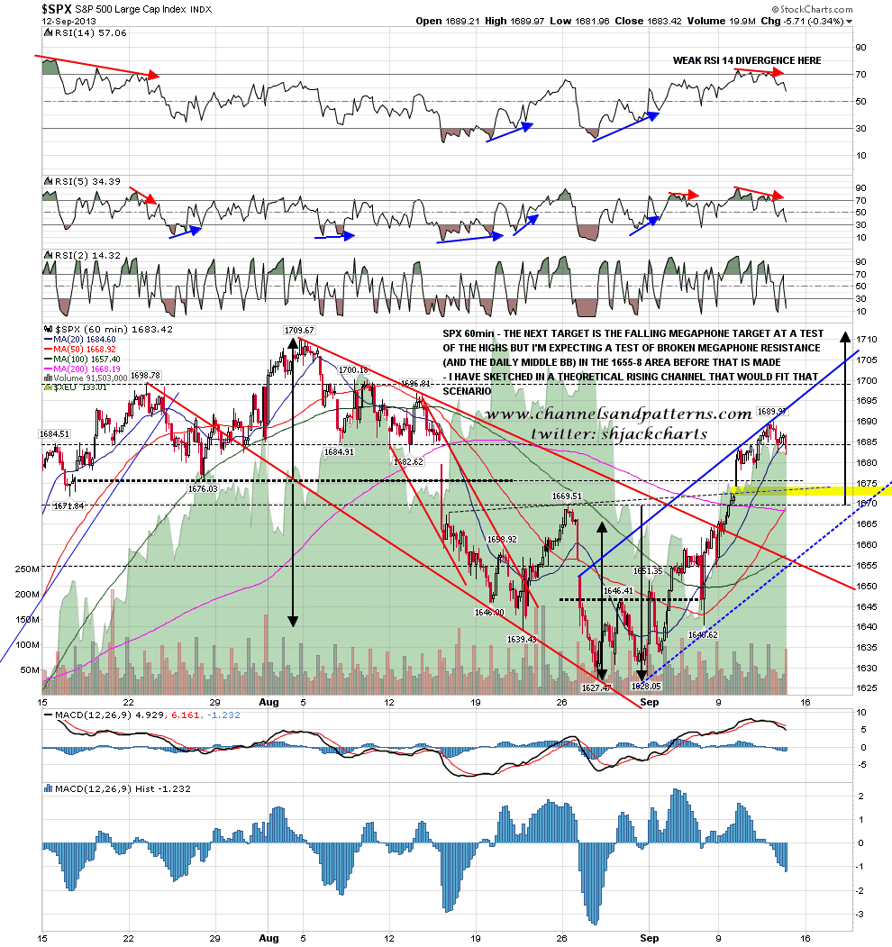 On the SPX 60min chart I have the broken falling megaphone resistance trendline currently in the 1656-8 area and we might well see that retested with the move to the daily middle bollinger band, so that would make two decent support levels in the mid-1650s. SPX 60min chart: