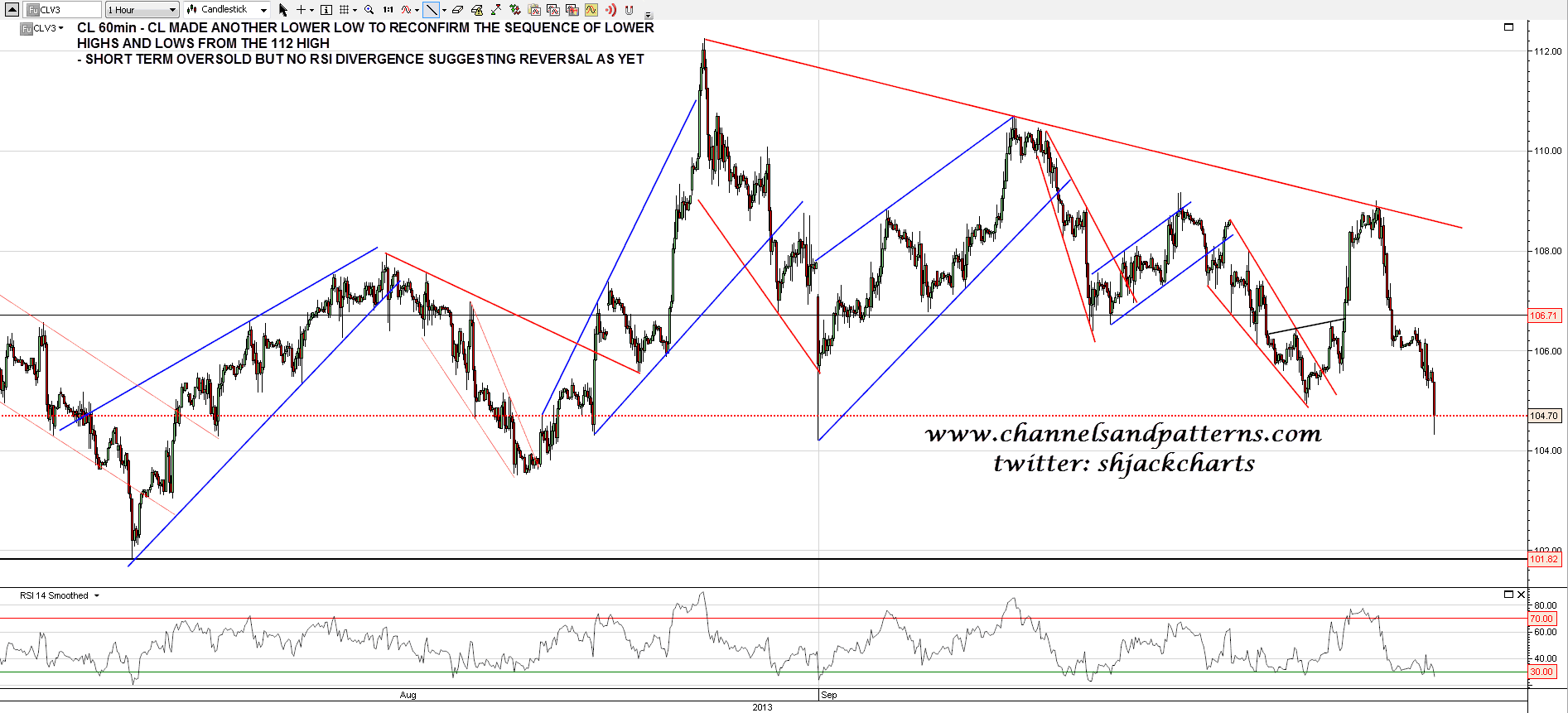 CL made a lower low since Friday morning and that has reconfirmed the current sequence of lower highs and lows since the 112 high. I’d expect a bounce sometime soon but there’s no RSI divergence as yet. CL 60min chart: