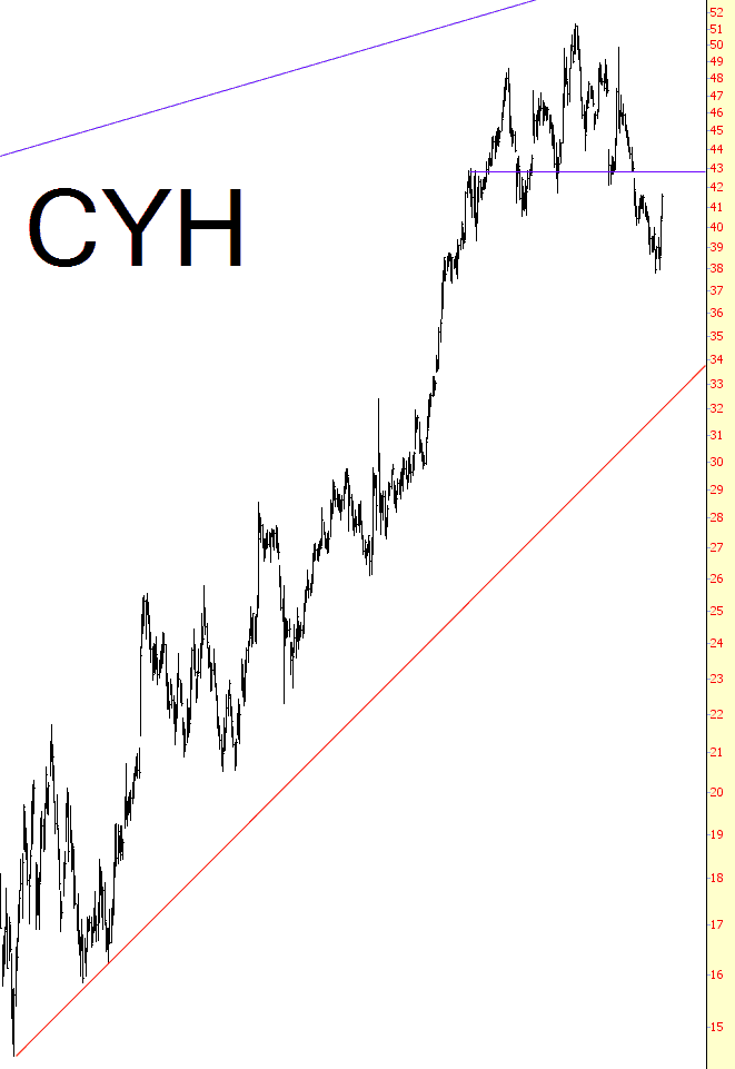 Community Health Systems, shown below, is approaching its gap at $42.80 and, I believe, offers a good risk/reward ratio on the short side.
