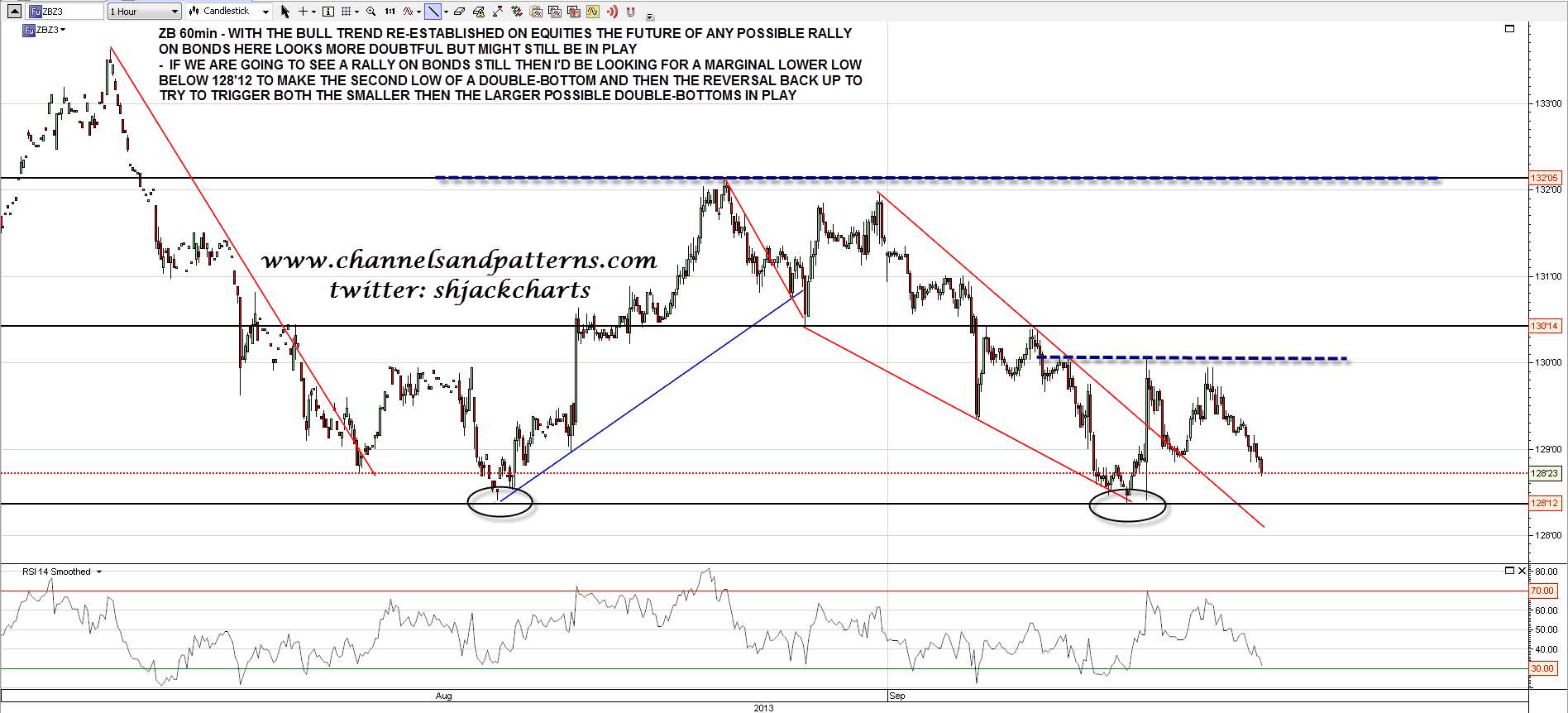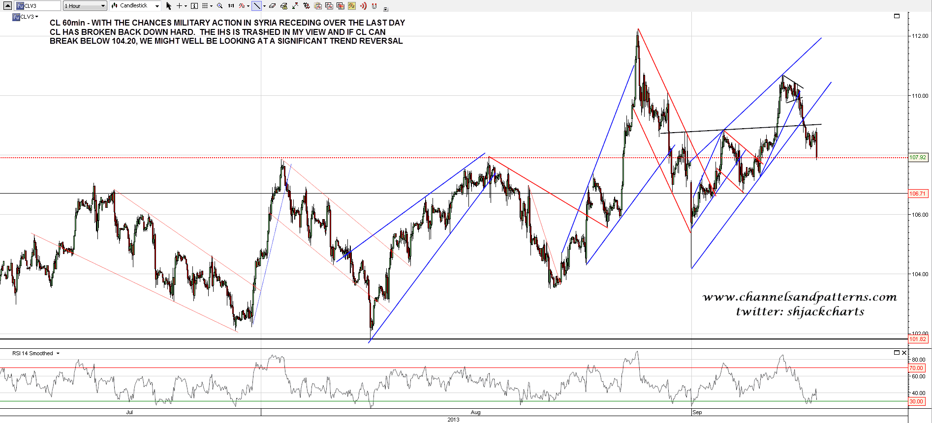 I was wondering how durable the uptrend on CL would be if the prospects for intervention in Syria dimmed, and CL has broken back down under 110, then the IHS neckline at 109, was testing 108 at the time I capped the chart below, and is now testing 107 at the time of writing. If we see 104.2 broken that would deliver a lower low and possible significant trend reversal. CL 60min chart: