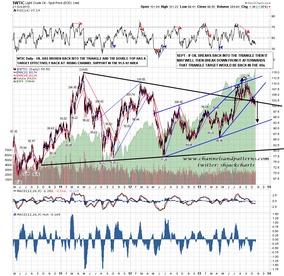 I was saying last week that if oil broke back below 100 then I have a double top target in the 92.5 area, close to rising channel support in the 91.5 to 92 area. That’s very much the case here, and CL is bouncing this morning, so I’m looking for a decent short entry there. Here is the bigger picture setup on the WTIC daily chart: