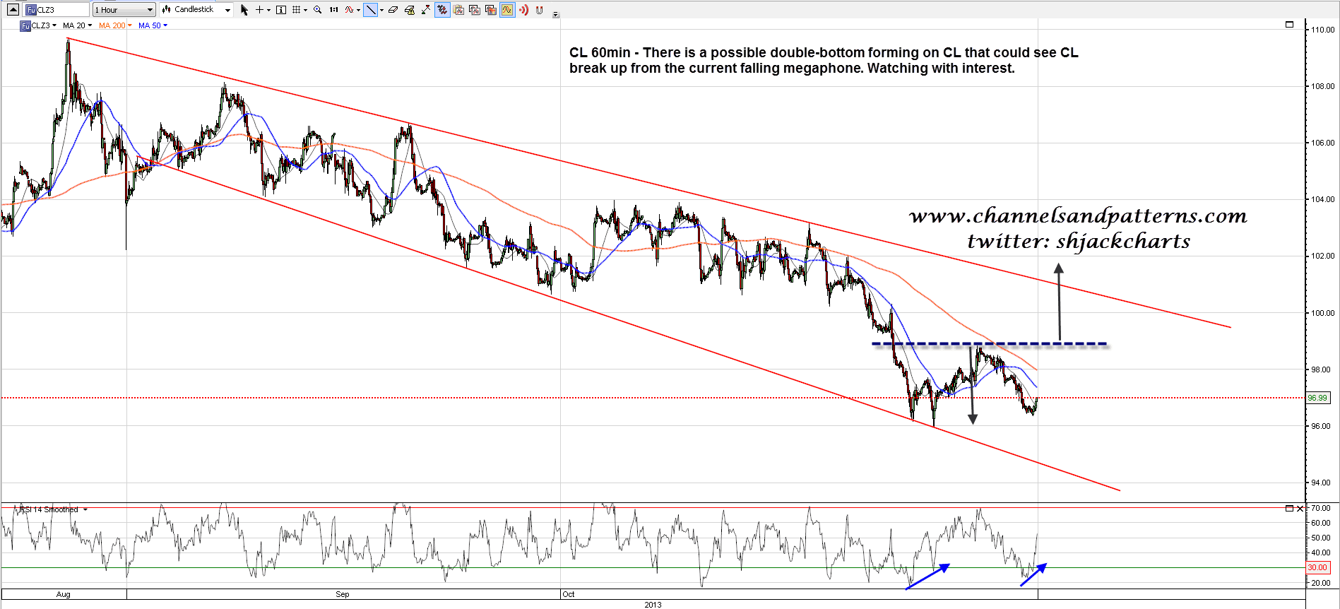 CL rallied a bit as I was expecting and has then retested the lows. There is now a very possible double-bottom forming that might be capable of breaking CL over the current falling megaphone. watching that with interest. CL 60min chart: