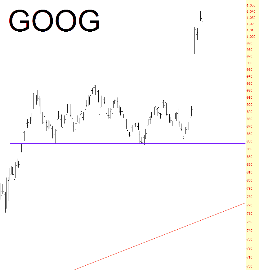 With AMZN and MSFT exploding higher, it was interesting that GOOG was off in the corner, clipping its toenails. This stock is very richly valued, and I shorted it at 1026.262 yesterday with a tight stop just above recent highs. It seems far more likely to soften here than surge yet again. It’s easier to trade these things once earnings are out of the way.