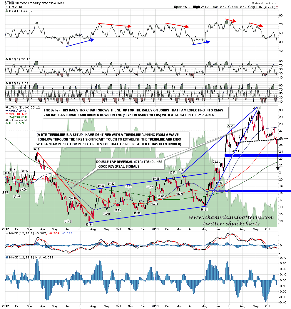I’ve been following the IHS on TLT in recent days and today I’ll show the inverted view of that on TNX, where the H&S targeting the 21 to 21.25 area broke down hard yesterday. We should now see a solid rally on bonds over the next few weeks into that target. TNX daily chart: