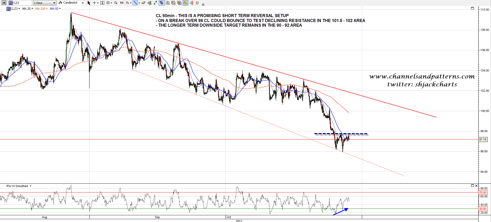 I’m very pressed for time today but I thought I should show the nice looking short term reversal setup on CL here that could deliver a strong bounce into the 101.5 area. The main downside targets are still in the 90-2 area but this could be a nice scalp long followed by a highly profitable short. CL 60min chart: