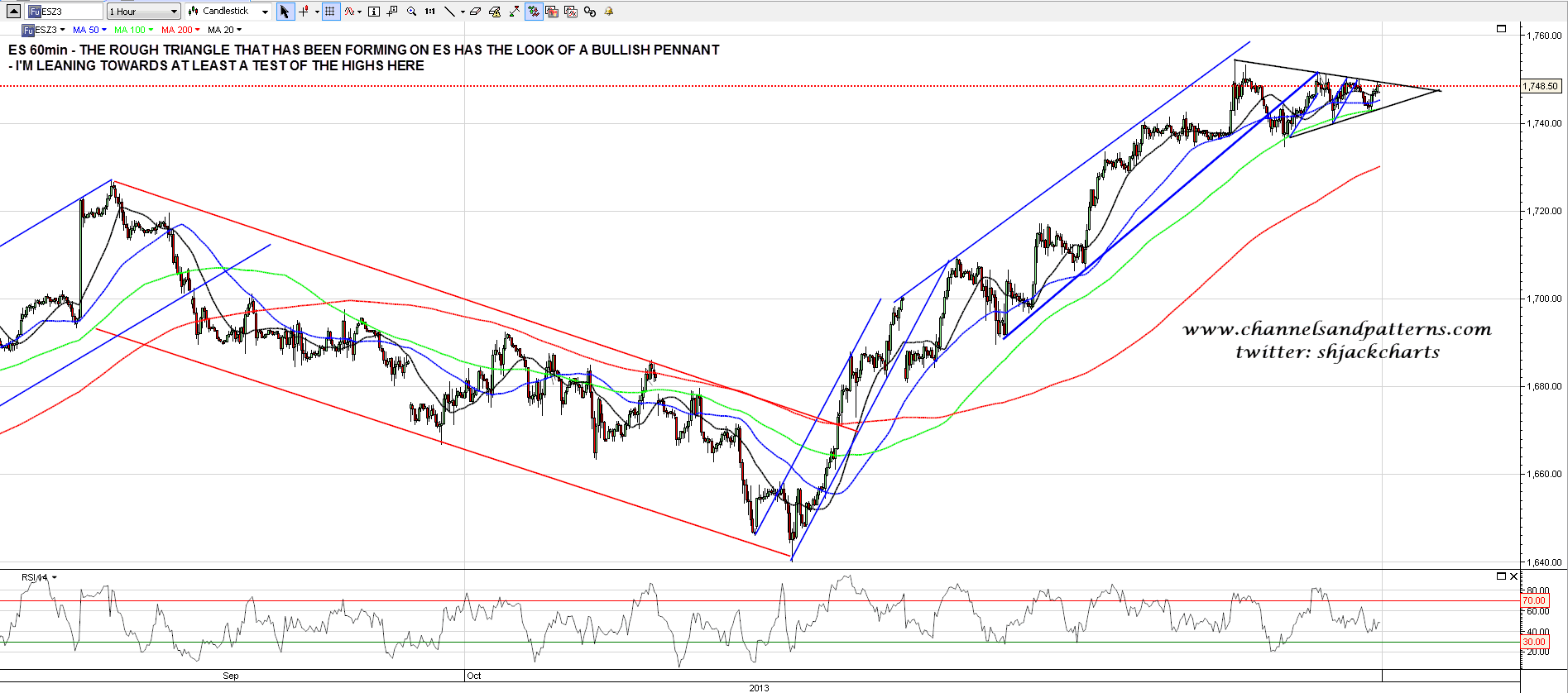 I’ve had a very busy morning with offline stuff so just a quick post today. There have been two promising setups for a decent decline on SPX and ES this week and, so far at least, both have just faded away as ES has instead been forming a rough triangle. In the context of the steep preceding rise I’m inclined to interpret this triangle as a (62%) bullish pennant, so I’m leaning towards at least a test of the highs here. ES 60min chart:
