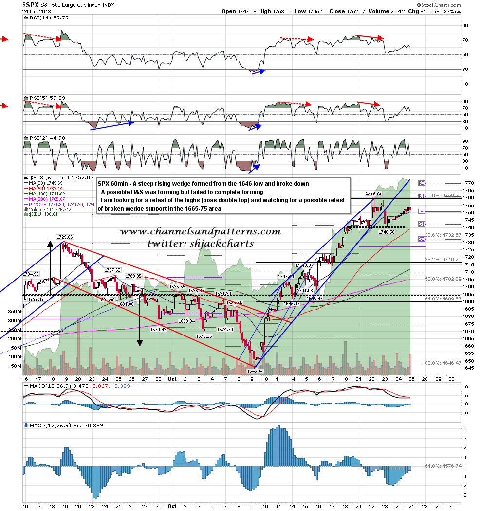 On the SPX 60min chart you can see the H&S that was forming and then faded away after reaching the top of the right shoulder. The most likely moves from here are a test of the highs to put in the second high of a double-top, or a break over the current highs, possibly to retest broken rising wedge support that would be in the 1770 area today. SPX 60min chart: