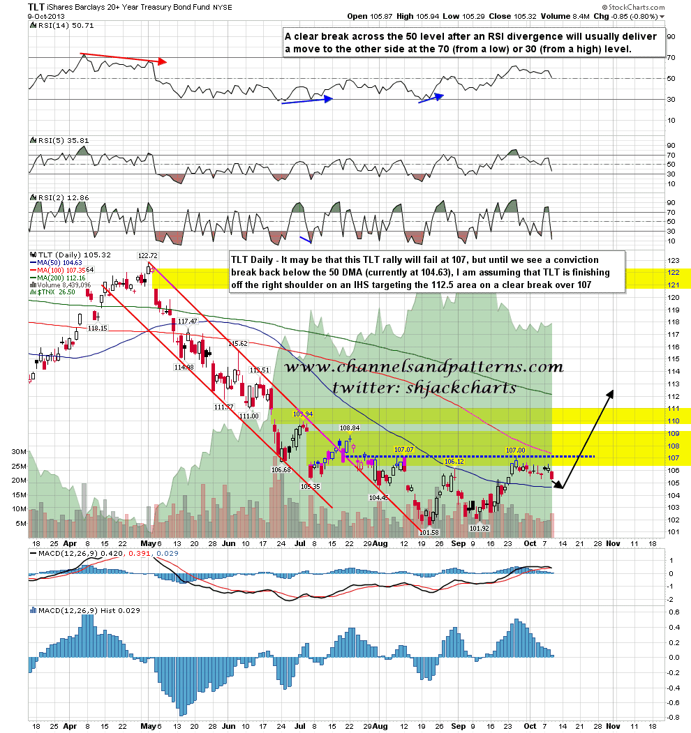 On other market large IHS patterns are close to completion on a number of bond instruments. Here is the one on TLT, which has a target in the 112.5 area on a clear break over 107. Support is at the 50 DMA in the 104.5 area. TLT daily chart: