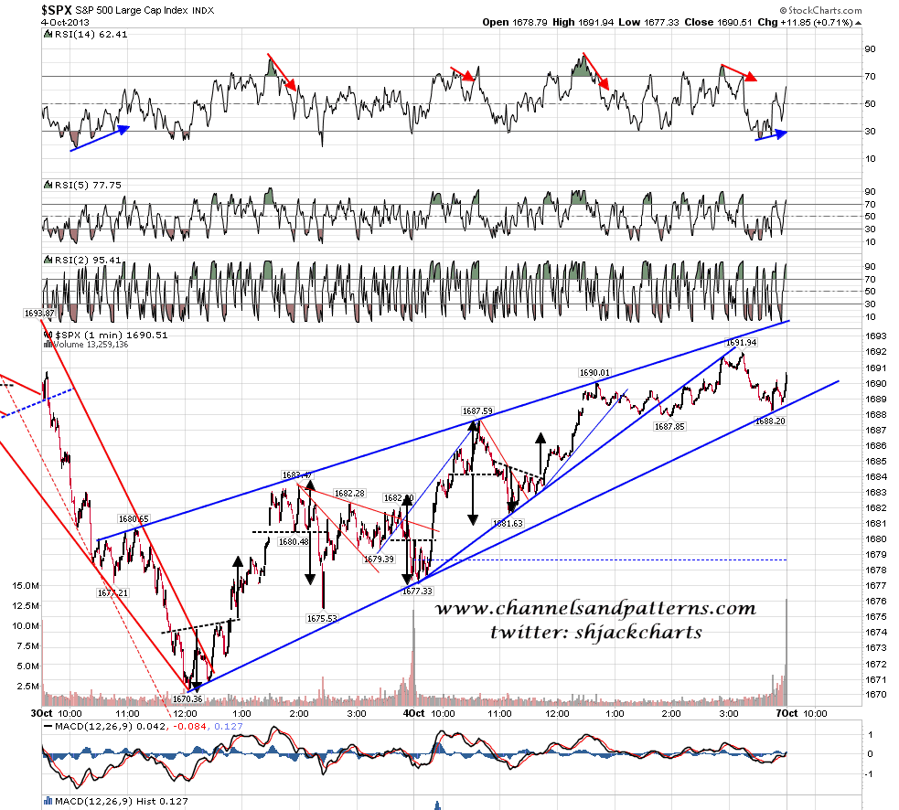 I lost four twitter followers over the weekend and I suspect that was because I posted the SPX 1min chart below after the close on Friday with the comment that it was very possible that SPX would gap down at the open today from the clear 70% rising wedge that had formed on Thursday and Friday. After two days of bullish action, and with many bulls declaring victory on twitter, I dare say my comment seemed improbable but patterns like these will generally deliver. If analysis by extrapolation worked then the best times to buy would be when bulls are most confident and the best times to sell would be when bears are most confident. In practice though the exact opposite is generally the case. SPX 1min chart: