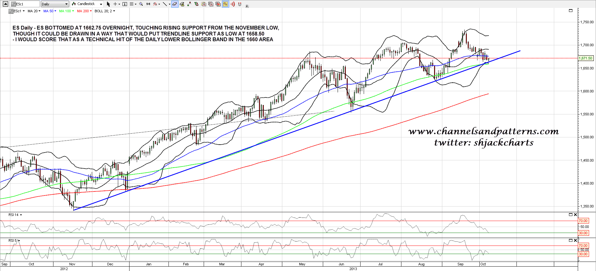 ES made a low at 1662.75 overnight, and I’m treating the targets on the ES chart I posted yesterday as hit. I have that as a good hit at rising support from November, and within three points of the daily lower bollinger band, so a technical hit of that. These are both decent support on the ES chart, though I could redraw that trendline for a hit in the 1658.50 area, so ES could go a bit lower without breaking support. ES daily chart: