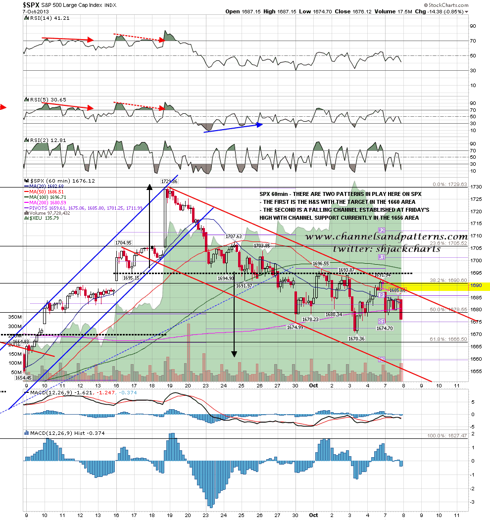 I have been looking very carefully at the trendline and pattern setup on SPX this morning and on closer inspection the falling wedge that broke up on Friday isn’t of high quality and I’ve discarded it. However I have found a perfect falling channel that was established at the high on Friday. On this 60min chart the important levels are the 61.85 fib retracement at 1666.50, the H&S target at 1660, and falling channel support in the 1655-8 area (depending on when it is reached. SPX 60min chart 1.5Mo: